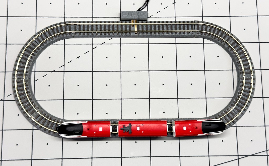 - An oval of Rokuhan’s Z-gauge track: This includes two 110mm straight pieces and eight R45 curved pieces, creating a very compact layout of 160mm x 110 mm (≈6.3 x 4.4inch)